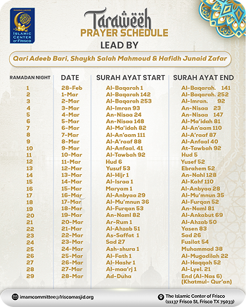 | # | Date | Sahoor | Iftar | Taraweeh |